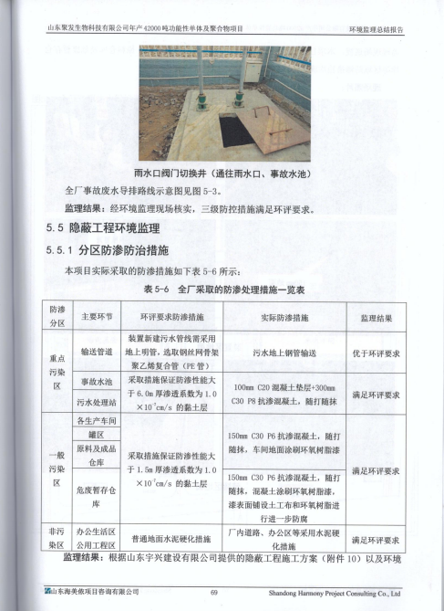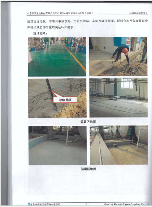 山东聚发生物科技有限公司于2016年开工建设,期间委托山东海美侬项目咨询有限公司担任工程监理,该公司依据有关环保法律法规及本项目环评和批复为抓手,对本项目施工过程环境保护进行全方位、全过程进行监理,对工程建设过程中污染环境、破坏生态的行为进行监督管理,放止或减少施工过程污染物排放和生态破坏,对工程的环保配套设施进行施工监理,落实项目环境影响评价文件中的环保设施要求,确保“三同时”的实施。特别是建设项目的分区防渗措施,重点对污水处理站、事故水池、污水管道、罐区、危废暂存间、生产车间的防渗施工进行严格监督管理,均按设计要求进行防渗施工监理。在该公司的《环境监理总结报告》第五部分:施工期环境监理落实情况,第5.5.1分区防渗防治措施中,对全厂采取的防渗处理措施一览表中进行了详细的描述。
